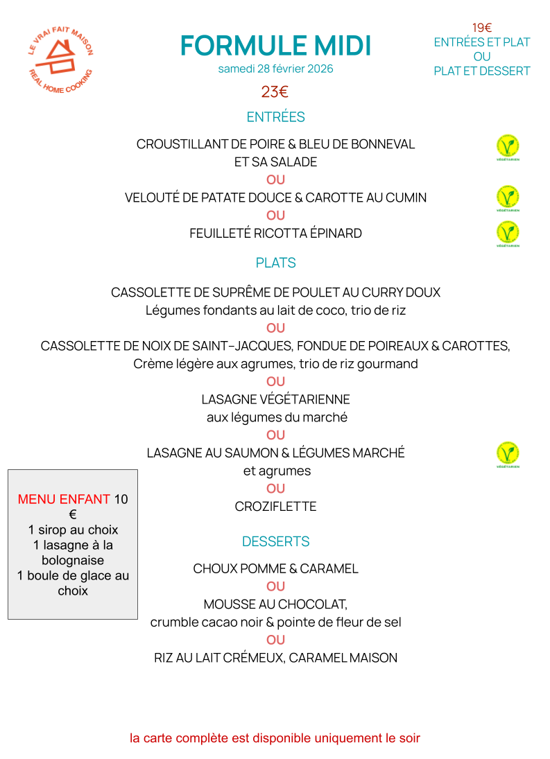 LES SAMEDIS MIDI DEUX SERVICES : 12H00 ET 13H30